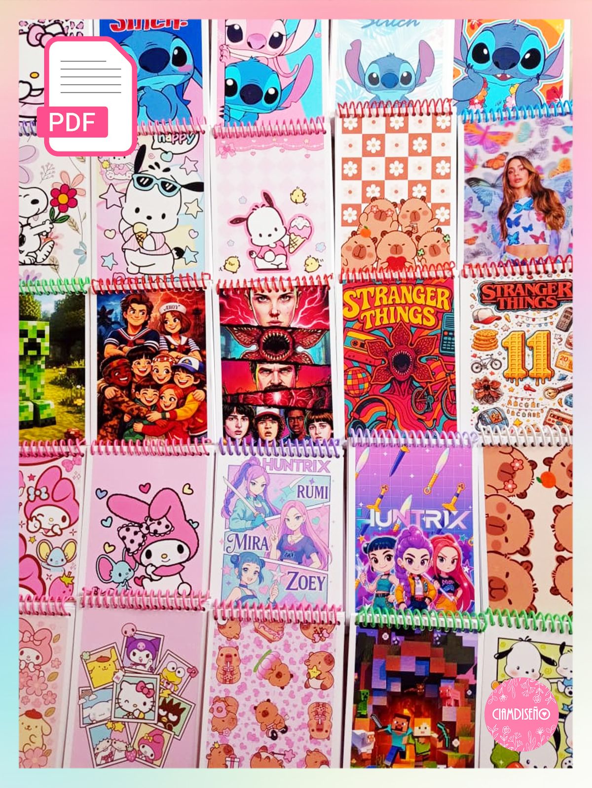 Diseños: 4 stitch, 4 kitty, 4 pochaco, 4 guerreras kpop, 4 flores, 4 snoopy, 1 tini, 1 emilia, 1 k4os, 1 maria becerra, 4 capibara, 4 stranger things, 4 kuromi, 4 minecraft, 2 dragon ball, 2 mario bros, 1 bob esponja, pokemon, 1 sonic, 1 hombre araña, 2 my melody, 2 sanrio, 1 lotso, 1 osito cariñosito, 2 perro salchicha.