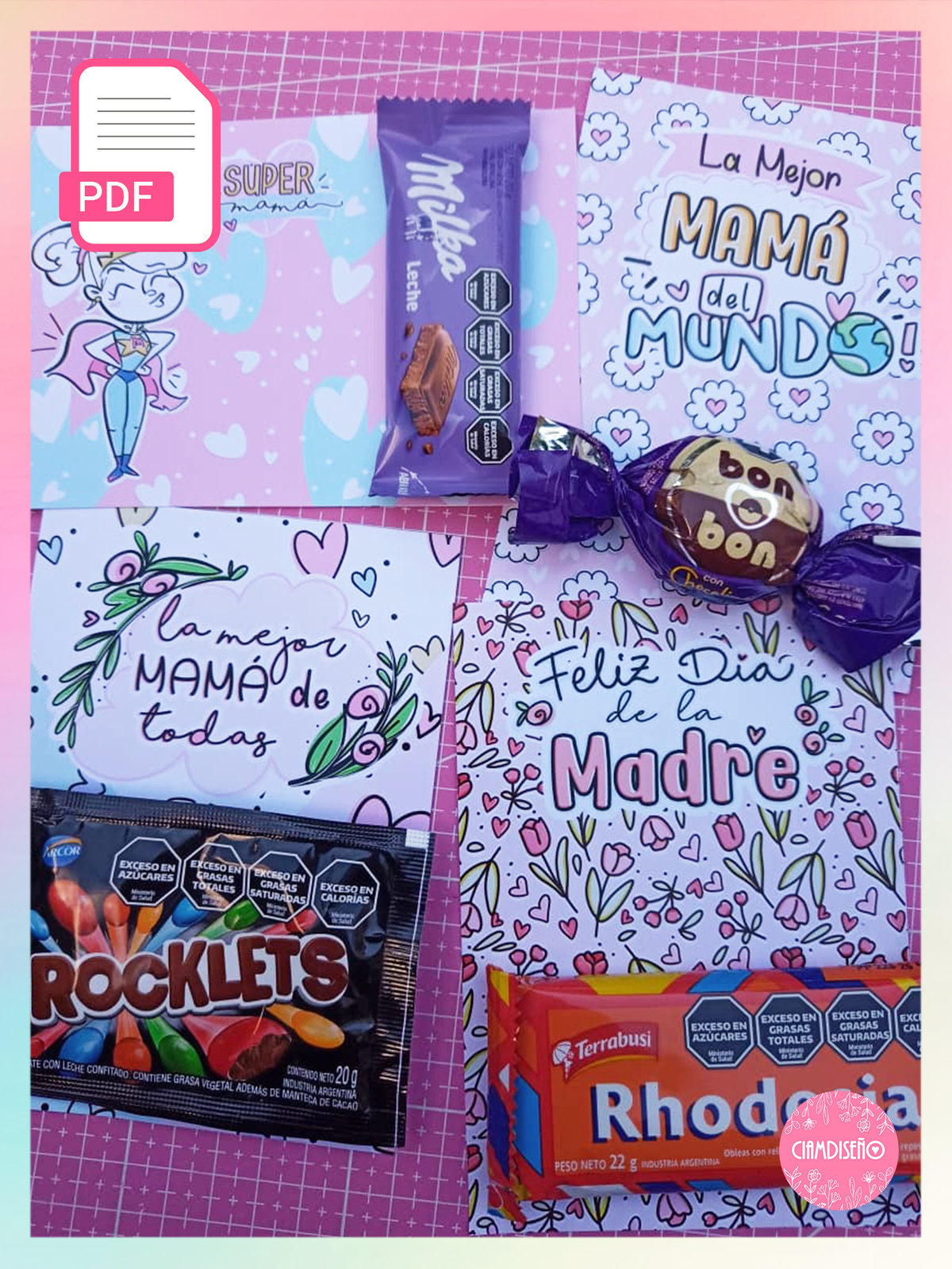 4 tarjetones para golosinas en solo una hoja A4.