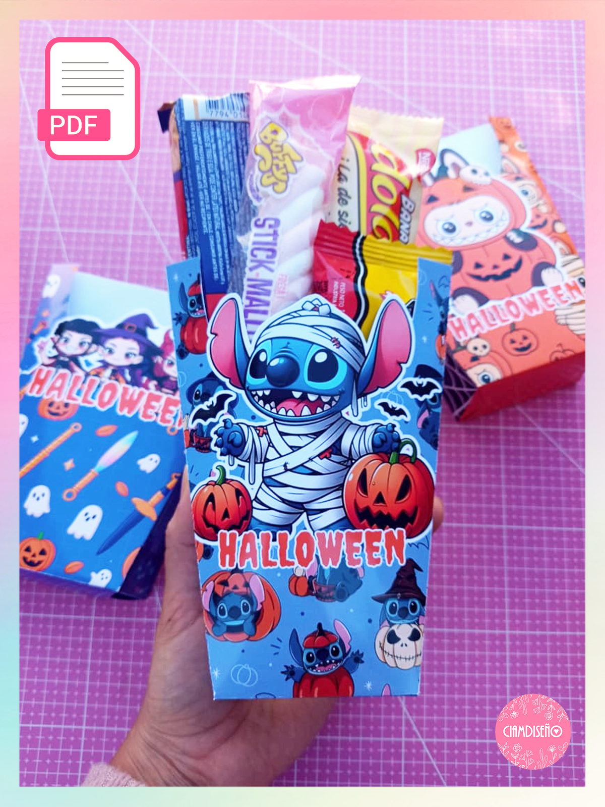 Incluye: Bruja, calabaza, fantasma, esqueleto, fantasma con gorro de bruja, labubu, kitty, capibara, stitch y guerreras kpop. Todo tematica halloween.